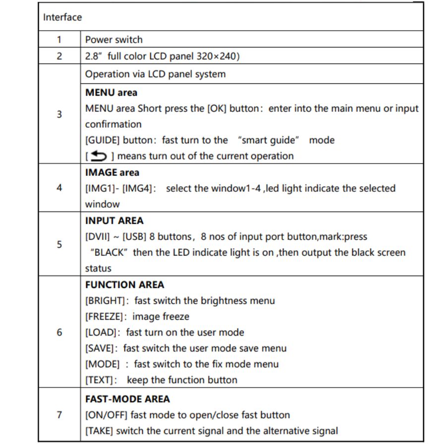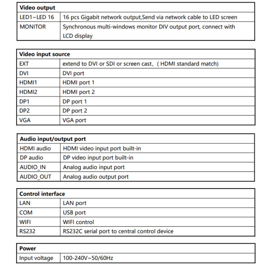 - Hỗ trợ cài đặt độ phân giải đầu vào tùy chỉnh cổng DVI\HDMI\DP 5 kênh;