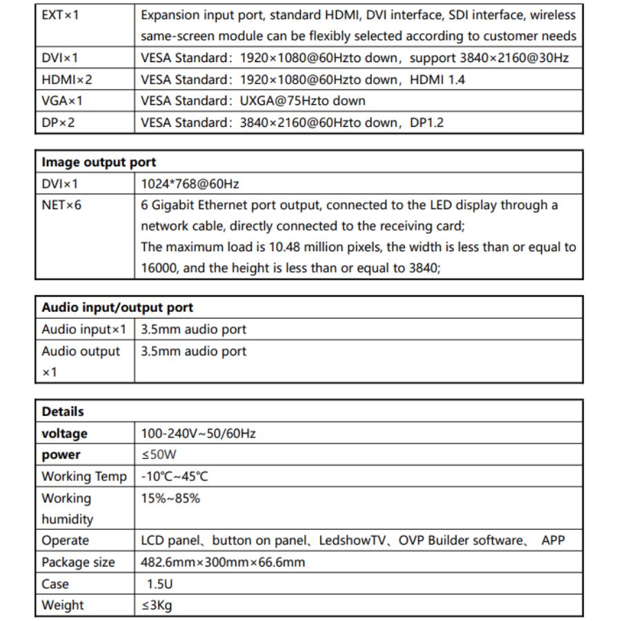 OVP-H8X có thể nhận đầu vào hình ảnh độ nét cực cao 4096×2160@60Hz và hiển thị hình ảnh bốn cửa sổ cùng một lúc. Đầu ra có độ phân giải cực lớn có thể đạt tới 4096×2160@60Hz, 8192×1080@60Hz, 16000×654@60Hz, v.v., có thể đáp ứng các yêu cầu ứng dụng của màn hình LED siêu lớn, màn hình hybridLED, màn hình có hình dạng đặc biệt, v.v. OVP-H8X cũng tích hợp 16 kênh.