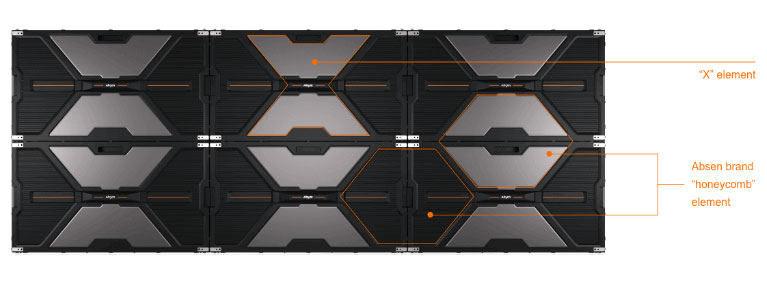 Là một biểu tượng của những khả năng vô hạn, chữ cái “X” trở thành một yếu tố thiết kế bên ngoài của bảng điều khiển và chữ X sẽ tạo thành một “tổ ong”, một yếu tố thương hiệu Absen. Thiết kế độc đáo truyền đạt sự tự tin của Absen về chuyên môn hiển thị và chất lượng sản phẩm.