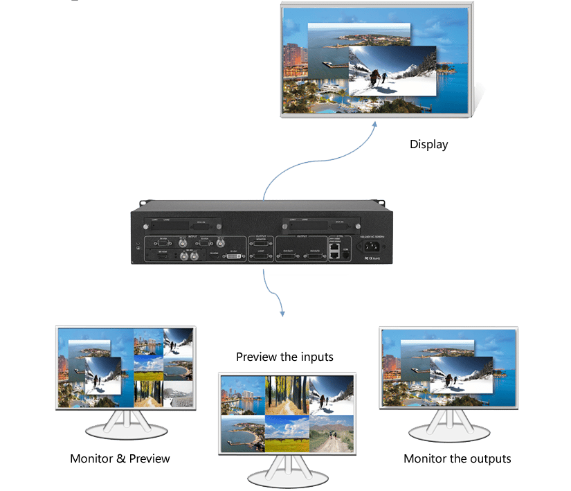 - Hỗ trợ đầu vào HDMI, DVI, VGA, SDI, CVBS, IP