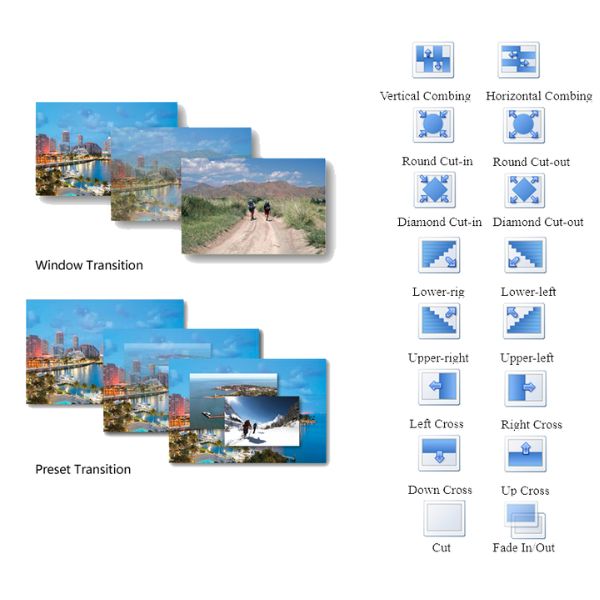 Khi chuyển đổi tín hiệu và chế độ, người dùng có thể chọn các hiệu ứng đặc biệt khác nhau, bao gồm: mờ dần và mờ dần, cắt thẳng liền mạch, chải dọc và ngang, cắt tròn trong và ngoài, cắt trong và ngoài hình kim cương, và rèm theo mọi hướng |
