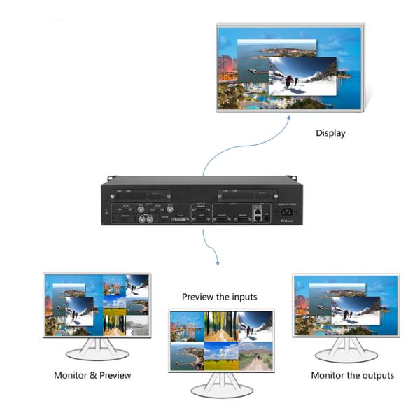 Bộ xử lý hình ảnh màn hình Led hay còn gọi là Led Video Processor là bộ xử lý tín hiệu hình ảnh ngõ vào bao gồm: HDMI, DVI, VGA, Video, HD-SDI,… chuyển đổi thành tín hiệu DVI để đưa vào Card gửi đồng thời nó sẽ xử lý đúng với độ phân giải chính xác của màn hình Led. Ngoài ra nó còn có các phím chức năng cứng phía trước, giúp người dùng có thể dễ dàng thao tác chuyển đổi qua lại giữa các nguồn tín hiệu đầu vào và các chức năng liên quan.