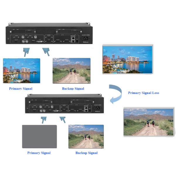 Người dùng có thể chỉ định tín hiệu dự phòng cho tín hiệu đầu vào, khi tín hiệu hiện tại bị lỗi, hệ thống sẽ tự động xuất tín hiệu dự phòng và có thể tự động quay lại khi tín hiệu được khôi phục. |